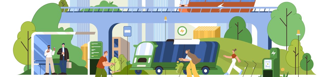 Sustainable transportation concept. Flat people use electric bus, eco friendly or ecological modes of public transport. Characters rent kick scooters, walk and lead active lifestyle in modern city.